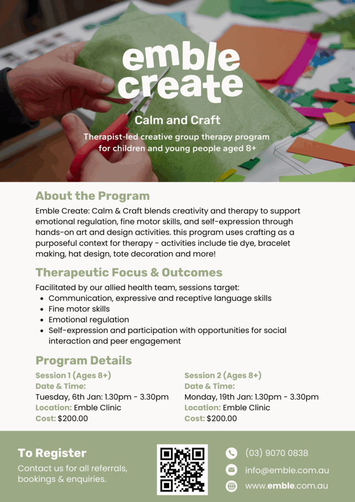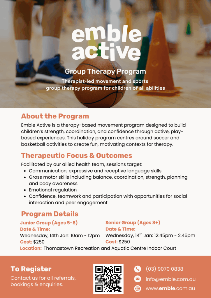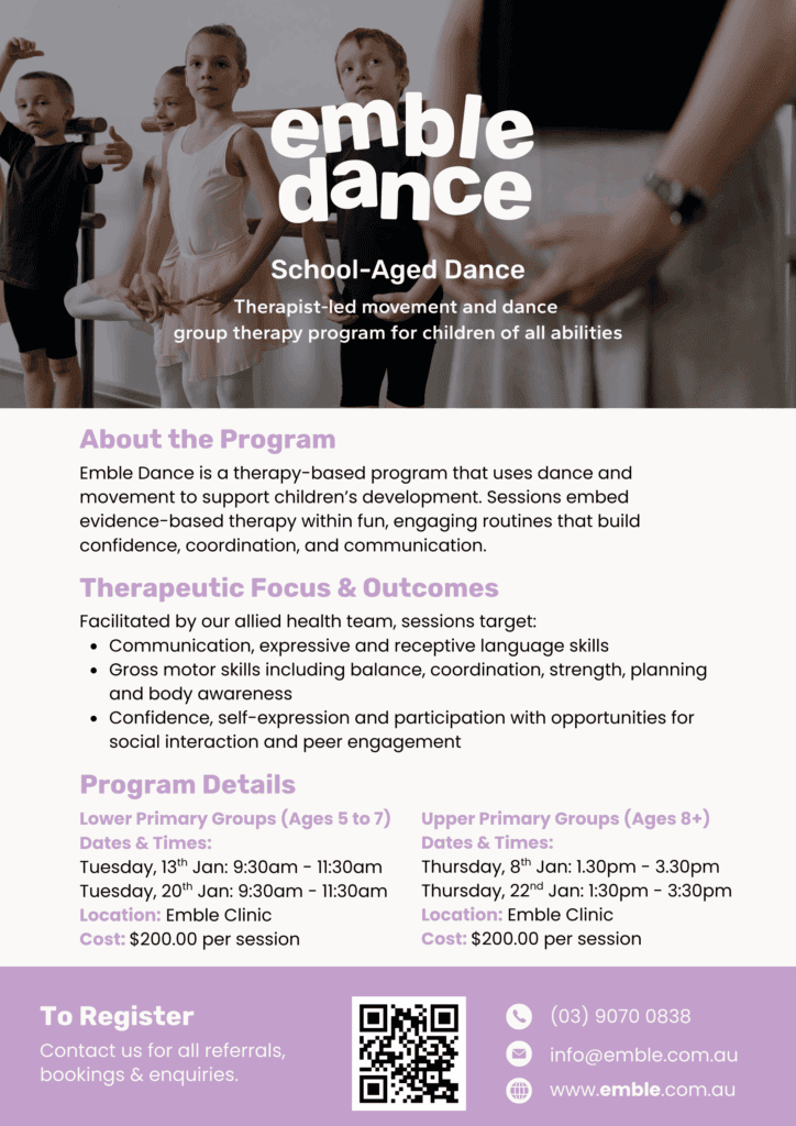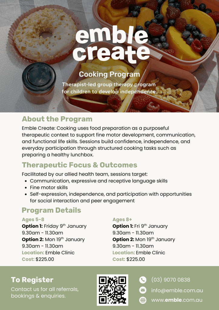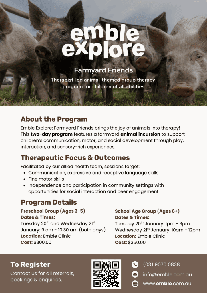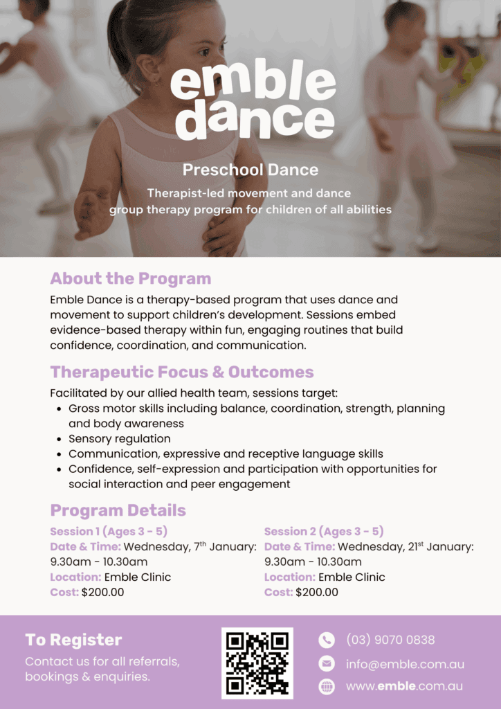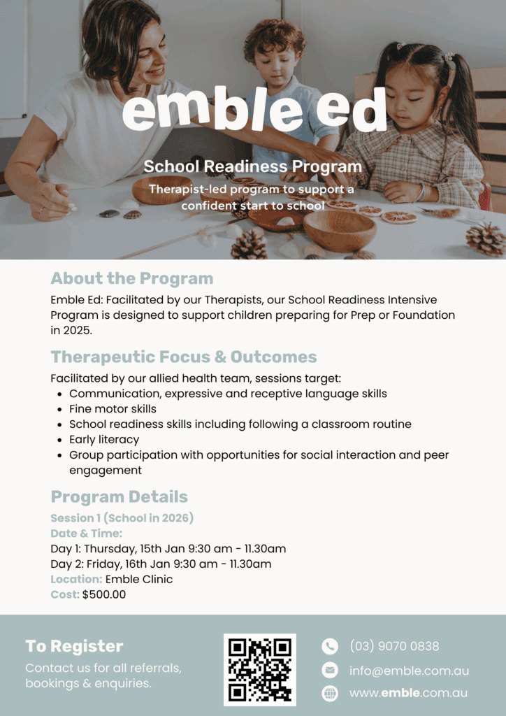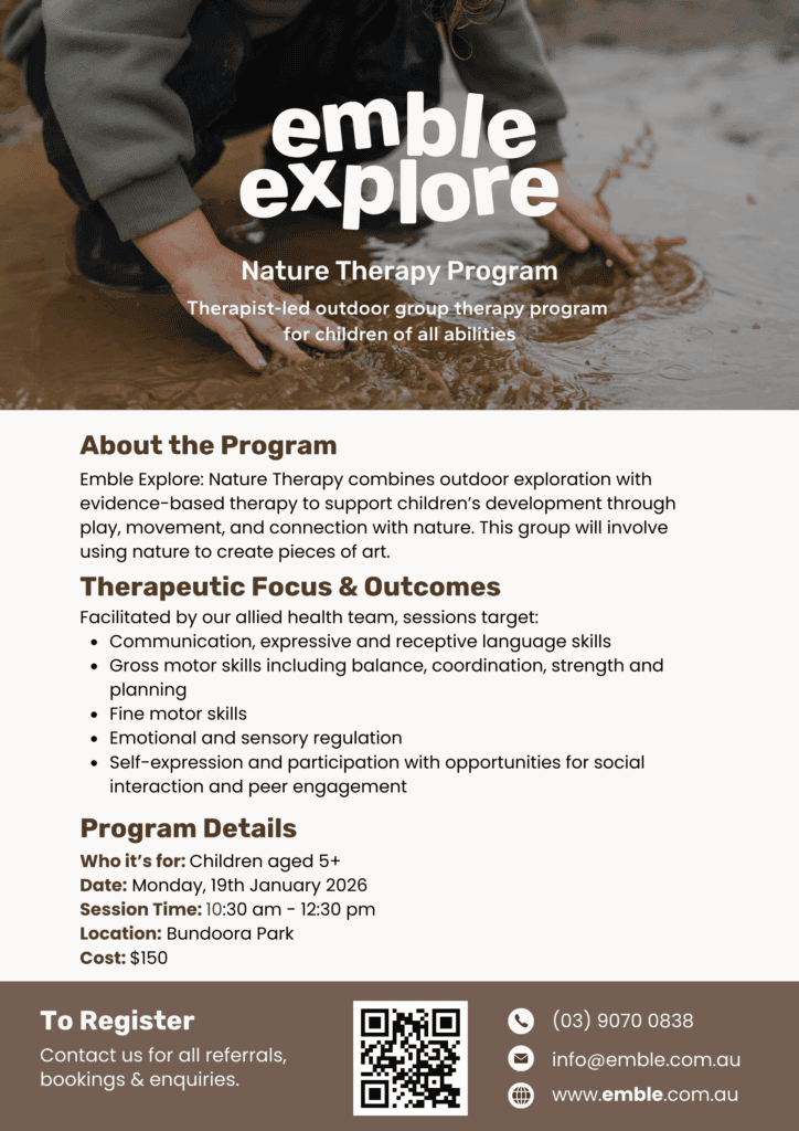 For families new to Emble, we will organise an initial consultation with a therapist to discuss your child’s developmental needs and ensure the group is clinically appropriate.